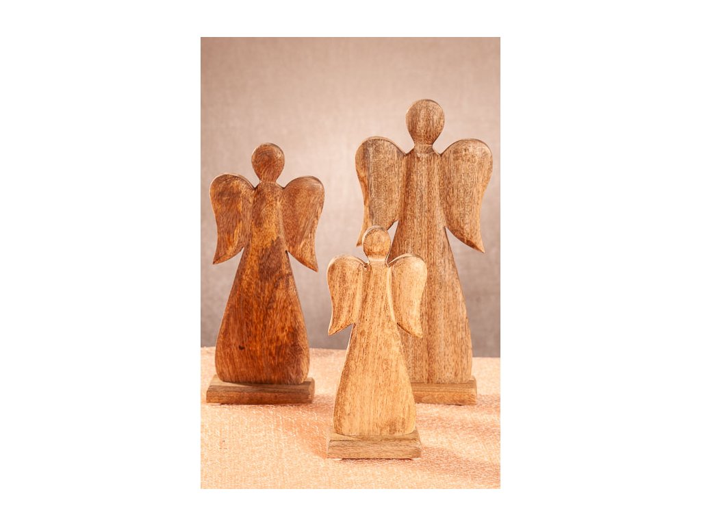 Tento dřevěný andílek je vysoký 27 cm a je vyroben ze dřeva mangovníku, které je obzvláště pevné a velmi odolné. Snadno jej poznáte podle jeho teplého vzhledu, krásné barvy dřeva, charakteristické struktury vláken a skvěle zapadne do každého interiéru.