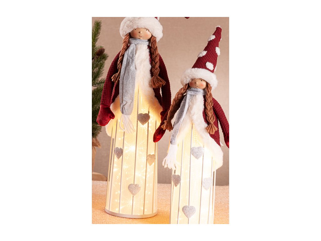 EMILY vánoční dekorace svítící je určena k postavení. Panenka EMILY má svítící tělíčko a působí jako lampička, kterou je možné kdykoli zapnout a nebo vypnout. Na hlavě má červenou čepici s bílými puntíky a kolem krku má omotanou stříbrnou šálu. Její výška je 48 cm.
