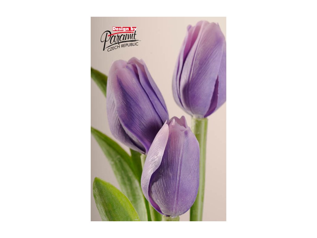 Aranžovací květina francouzského tulipánu v fialovo bílé barvě od české značky Paramit. Použitím umělého materiálu je dosaženo, že květina drží pořád stejný vzhled a nevadne.