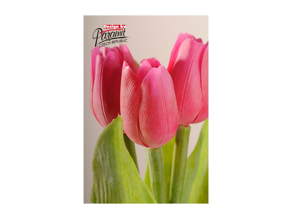 Aranžovací květina francouzského tulipánu v červeno-růžové barvě od české značky Paramit. Použitím umělého materiálu je dosaženo, že květina drží pořád stejný vzhled a nevadne. Tulipán obsahuje jeden květ a jeden list, je vysoký 40 cm.