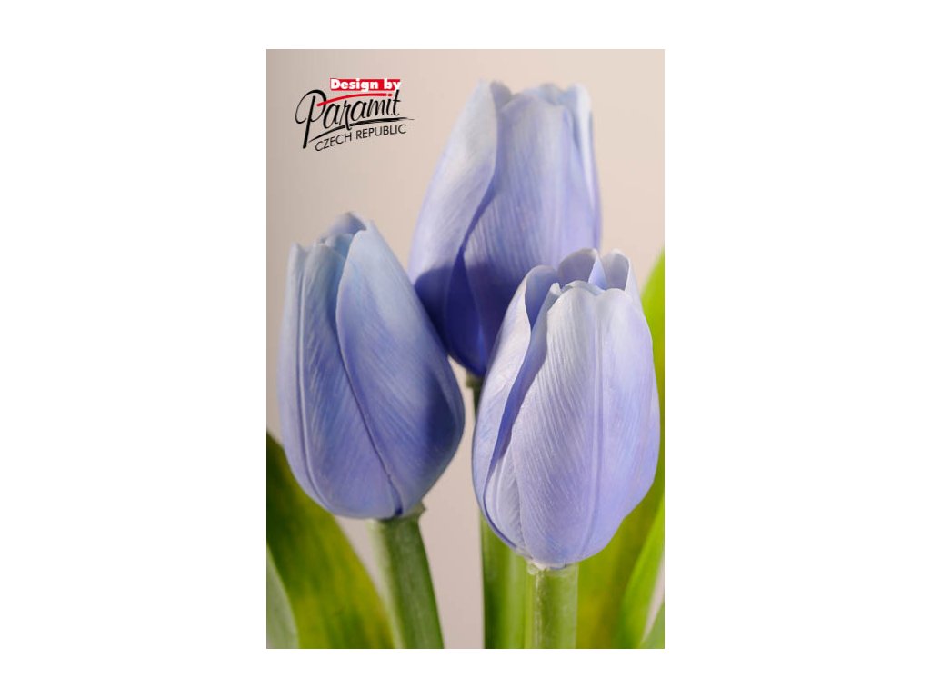 Aranžovací květina francouzského tulipánu ve světle modré barvě od české značky Paramit. Použitím umělého materiálu je dosaženo, že květina drží pořád stejný vzhled a nevadne. Tulipán obsahuje jeden květ a jeden list, je vysoký 40 cm.