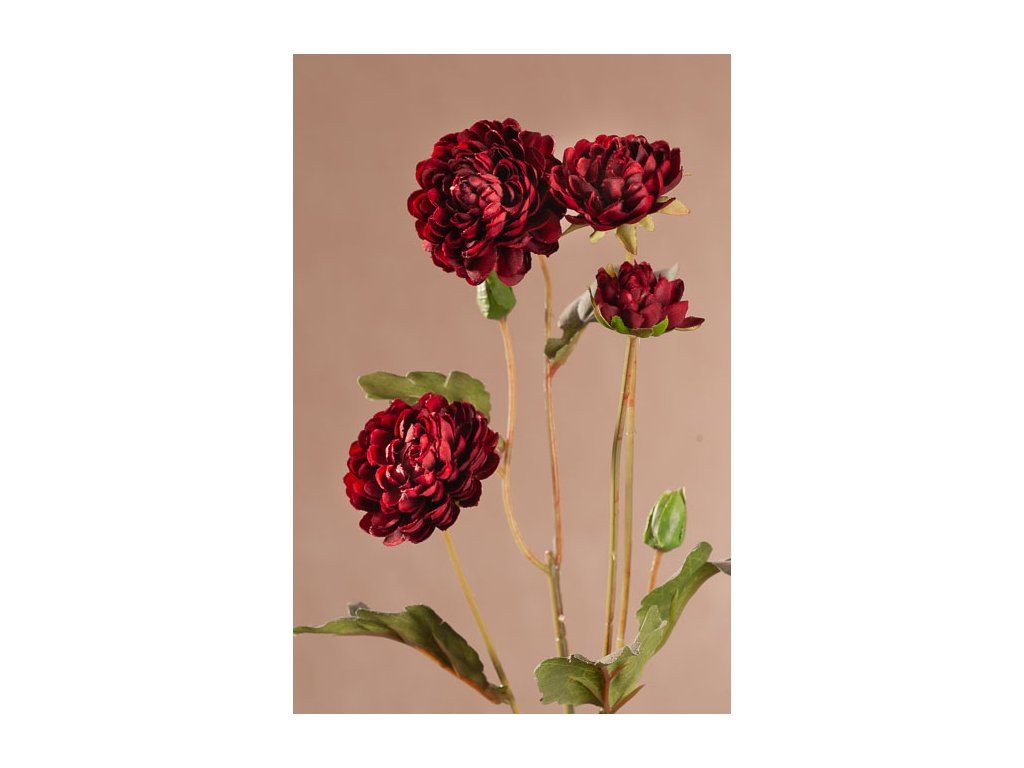Oblíbená květina chryzantéma je provedena v krásné a výrazné červené barvě a má 4 větvičky na stonku, který měří 69 cm. Na větvičkách jsou čtyři květy a dvě poupata. Lístky jsou zbarveny do šedozelené zemité barvy.