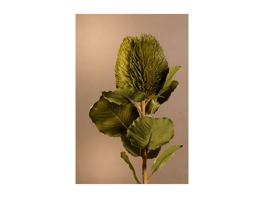 Krásná menší banksie olivově zelené barvy. Květina má jeden velký květ olivově zelené barvy a na stonku je 9 listů. Stonek je v barvě dřeva a listy zelené barvy jsou přirozené. Je propracována opravdu věrně a realisticky. Květina je jako živá.