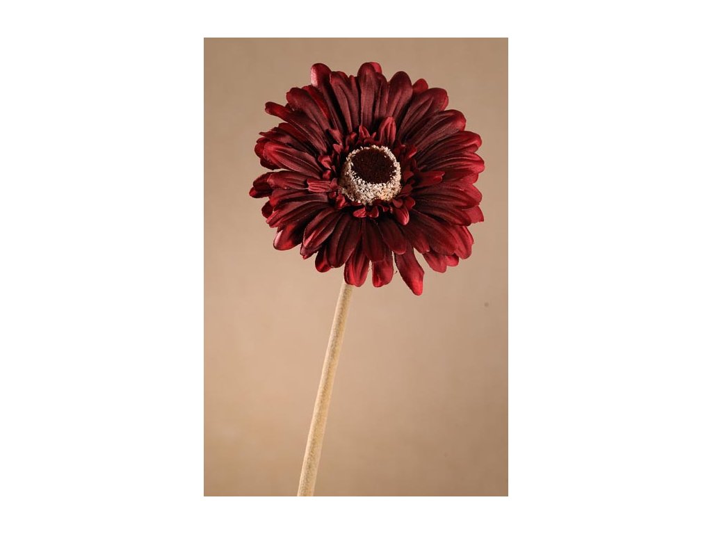 Květ červené gerbery je vínové barvy a je opravdu nádherný. Je velký cca 12 cm. Stonek je světle hnědé barvy, je takzvaně jemně "chlupatý" a působí jako sušená květina. Celkově však působí jemným a přirozeným dojmem.