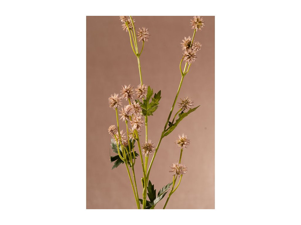 Umělá květina s malými bodláčky narůžovělé barvy. Stonek je dlouhý 68 cm a je na něm několik zelených listů. Její vzhled snadno zaměníte za živou květinu.