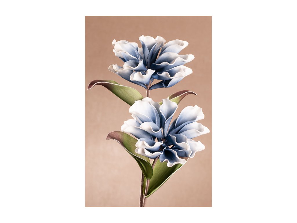 Krásná umělá květina se dvěma květy vystínované od bílé po modrou barvu od české značky Paramit, Je vyrobena z polyuretanové pěny a použitím tohoto materiálu je dosaženo, že květina drží stále stejný vzhled a nevadne.