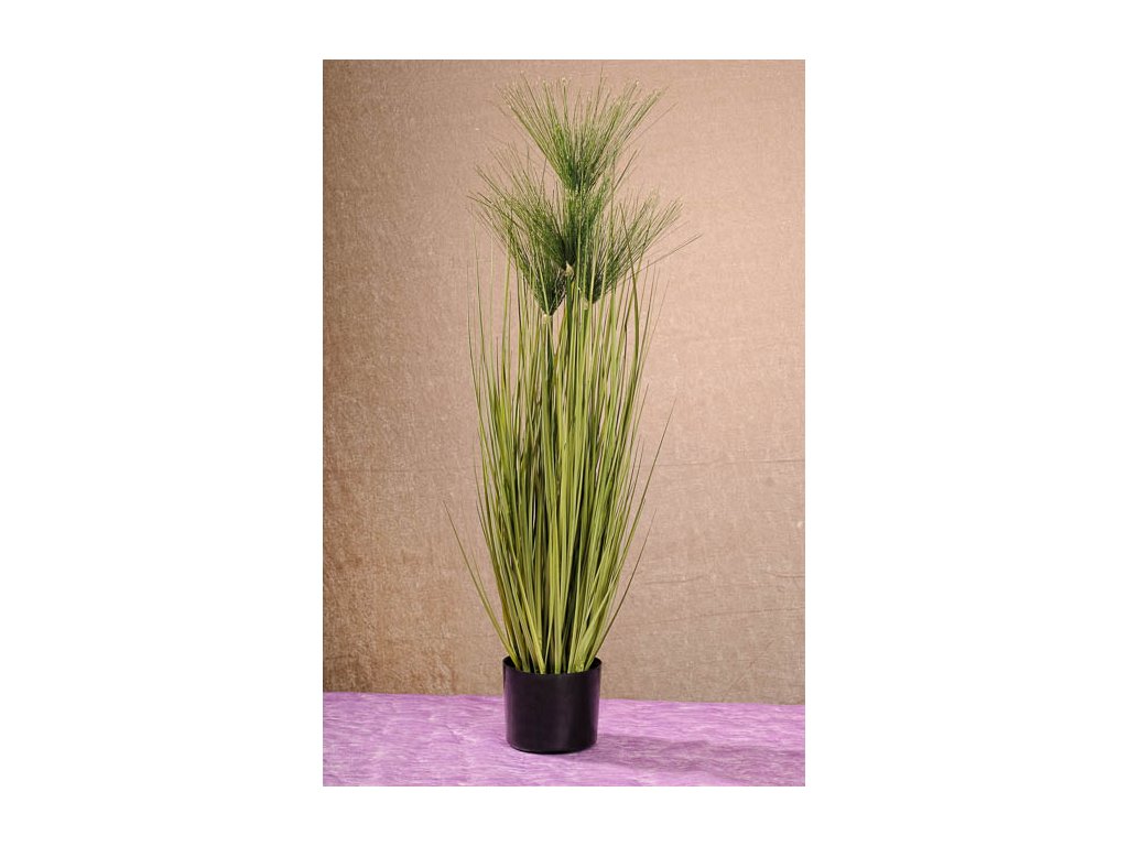 Umělý papyrus výšky 102 cm v dekorativním květináči se čtyřmi květy. Dekorativní rostlina Papyrus je vysoká 102 cm, takže ji jen tak nepřehlédnete. Rostlina je pěkně zpracovaná, je hustá a zdobí ji čtyři zelené květy. Bezvadně vynikne na terase, ve vstupní hale i v obývacím pokoji. Je nasazený v černém plastovém květináči o průměru 13,5 cm a výšce 13 cm.