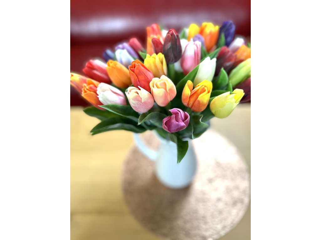 Květina vhodná pro aranžování samostatně jen do vázy nebo jako krásný doplněk velké kytice. Můžete je používat nejen v interiéru, ale i venku. Umělé tulipány nabízíme ve 24 barvách.