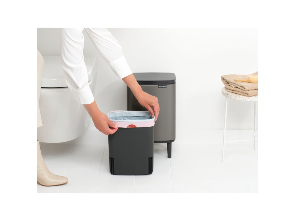 Koš šetří i místo, lze ho umístit ke zdi nebo do rohu místnosti. Zdarma jsou součástí balení balení jsou speciální sáčky vhodné pouze pro odpadkový koš BO, protože okraj sáčku zůstává ukrytý pod víkem koše.