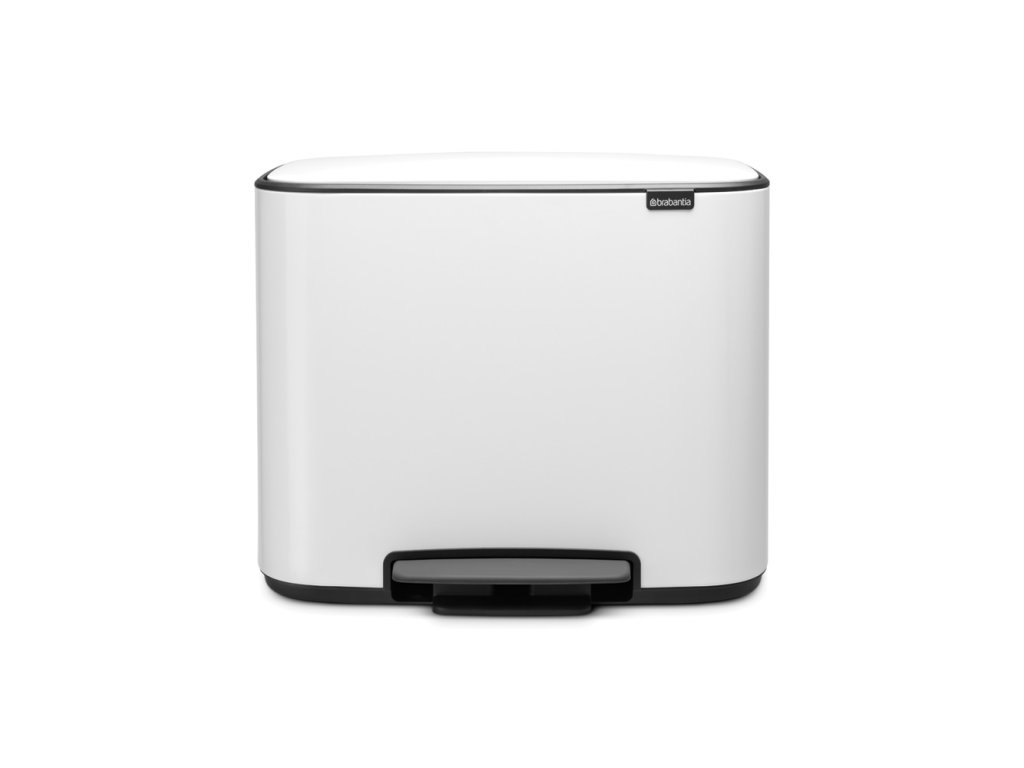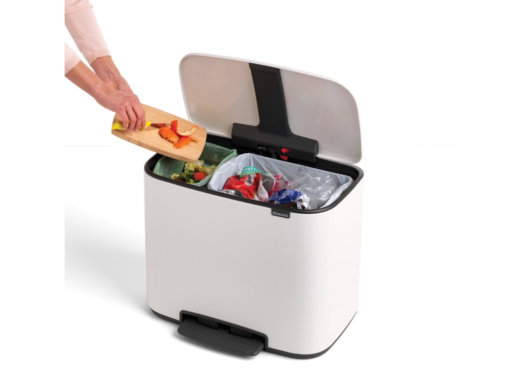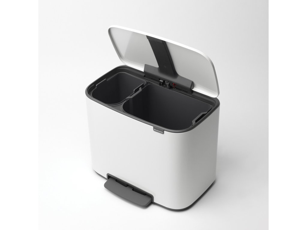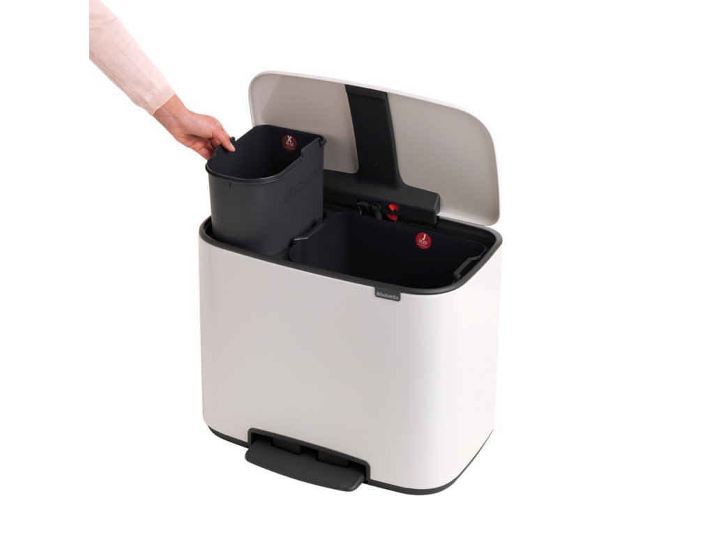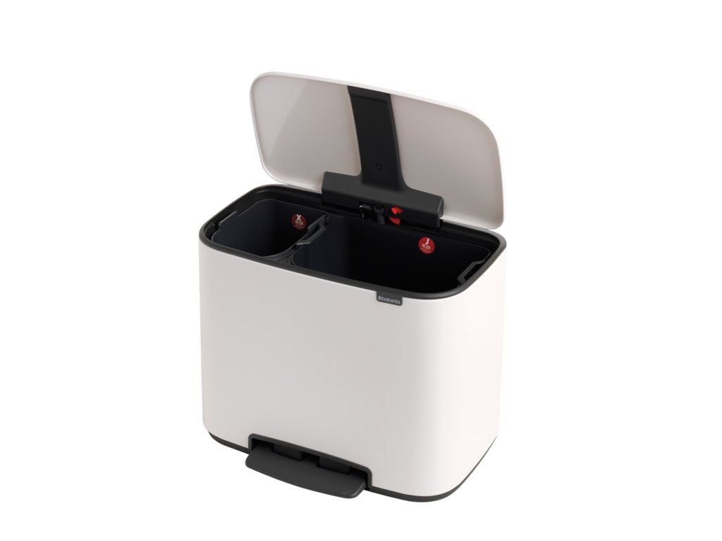 Inovace v ukládání odpadu pro ty, jež myslí na životní prostředí s BO košem na tříděný odpad v bílé barvě se dvěmi nádobami - 1x 11 l a 1x 23 l od výrobce Brabantia.