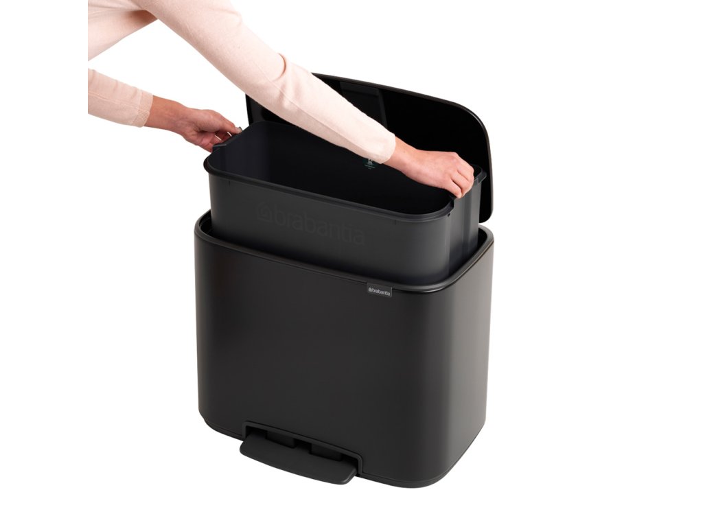 Manipulace je snadná díky tichému pedálovému systému otevírání a zavírání. Koš má vnitřní plastové vědro, což umožňuje snadné čištění a mytí. Odpadkový koš šetří i místo, lze ho umístit ke zdi nebo do rohu místnosti.
