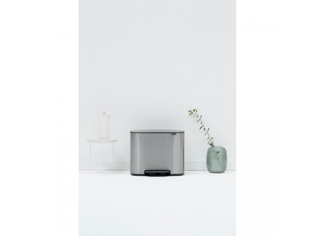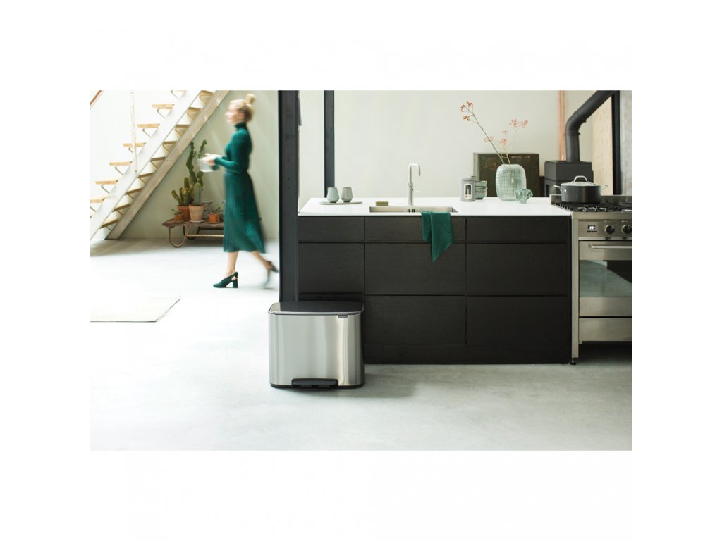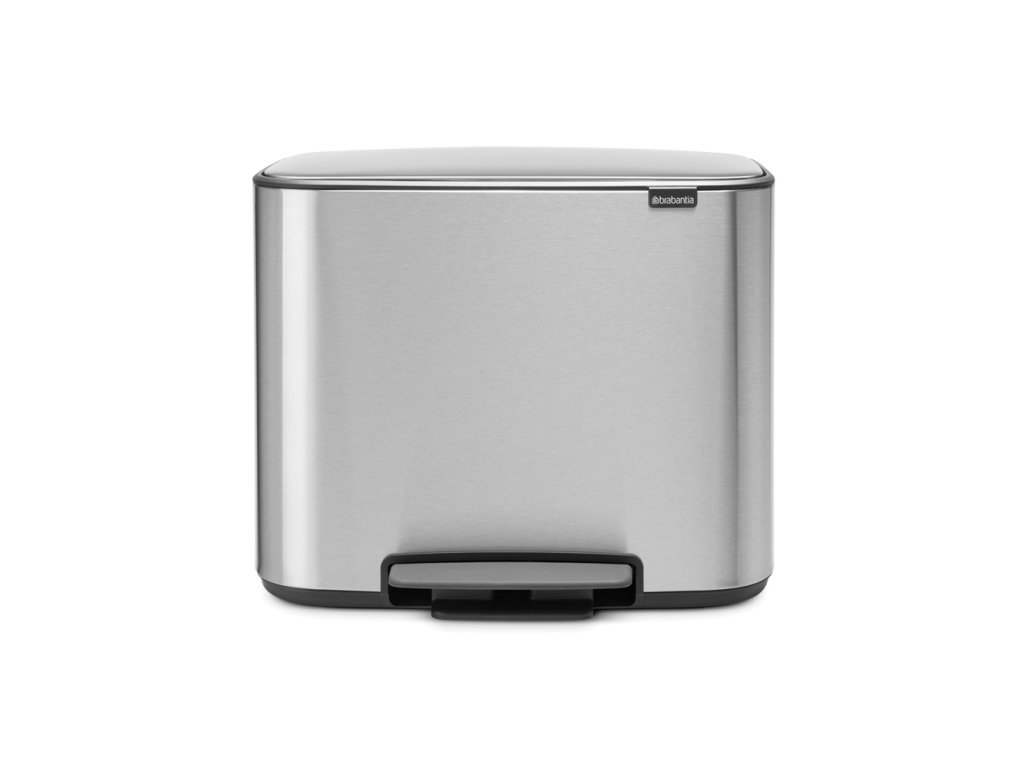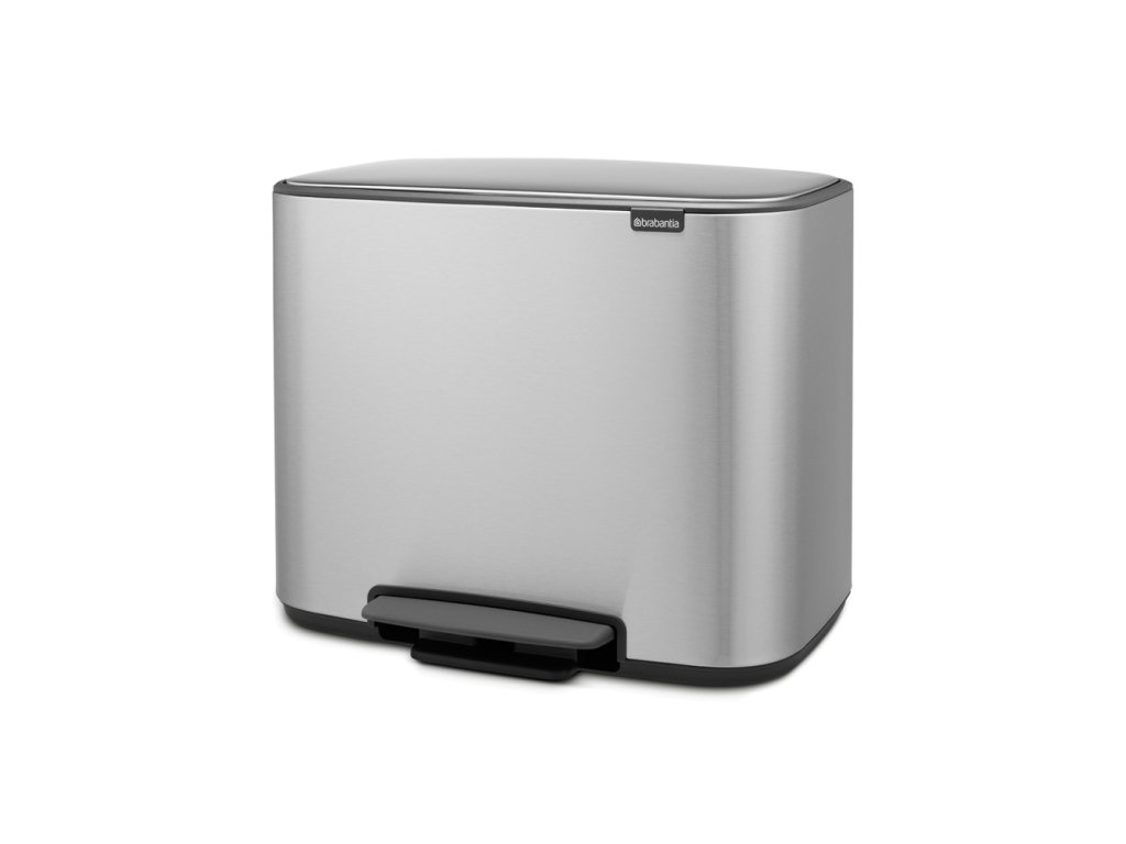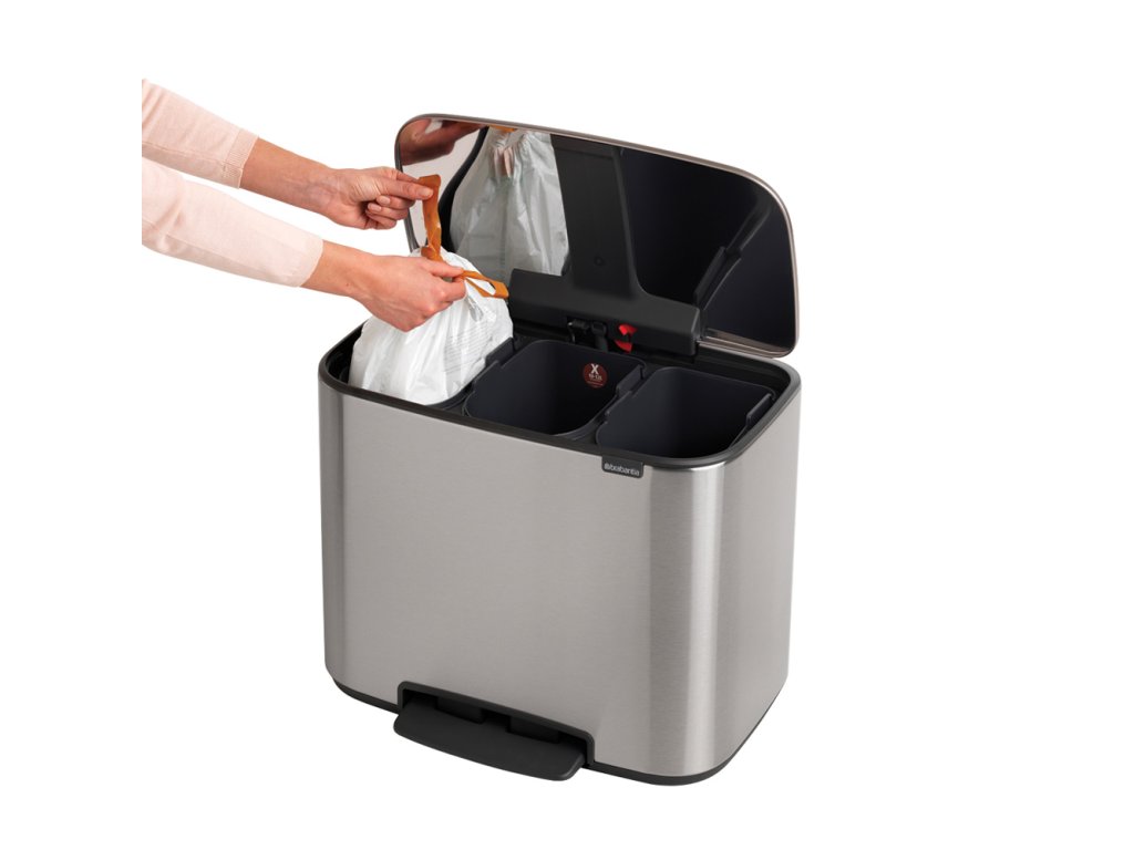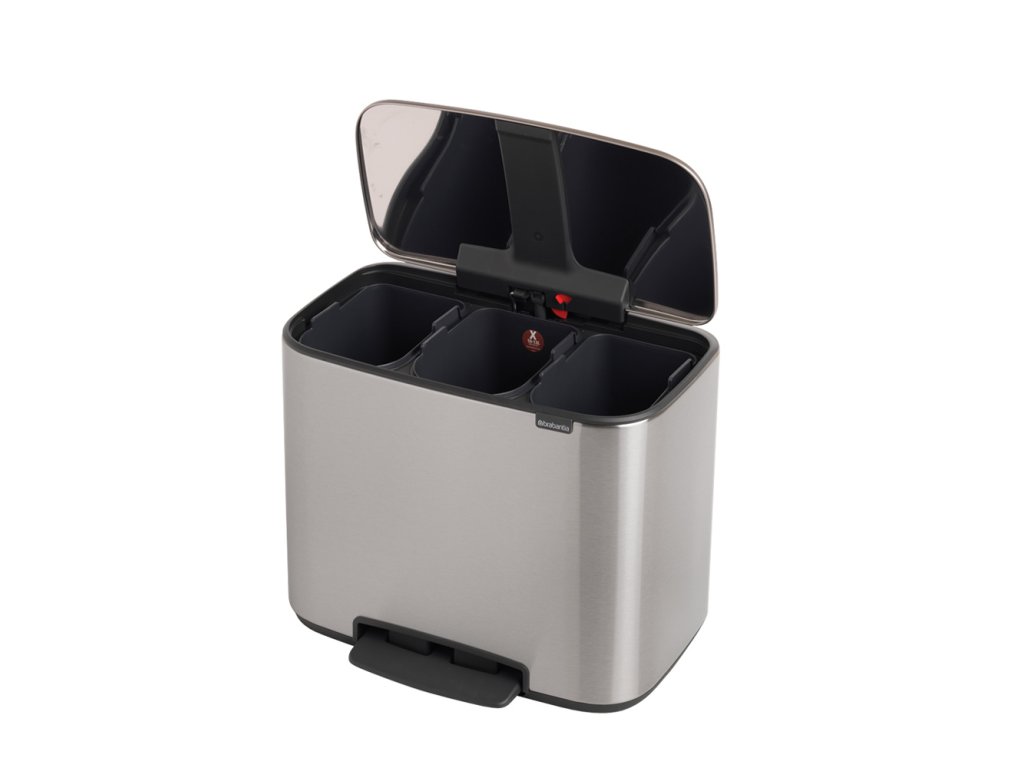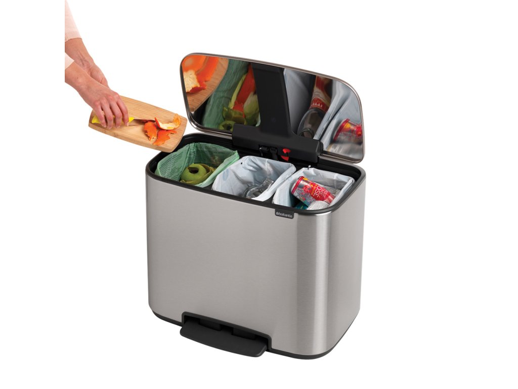 Inovace v ukládání odpadu pro ty, jež myslí na životní prostředí s BO košem na tříděný odpad v provedení matná ocel (FPP - Fingerprint proof - povrch odolný proti otiskům prstů) se třemi nádobami po 11 litrech od výrobce Brabantia.
