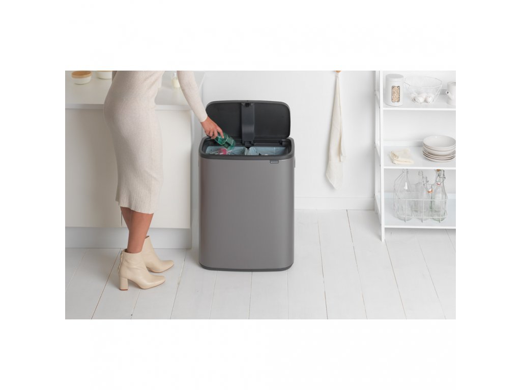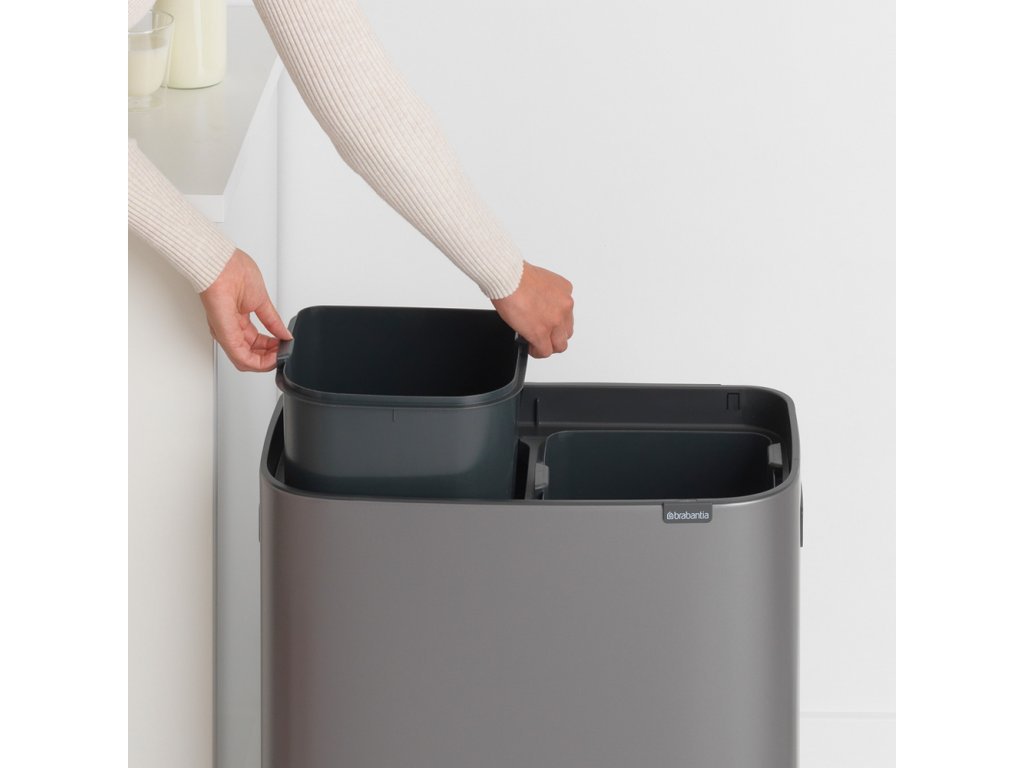 Inovace v ukládání odpadu pro ty, jež myslí na životní prostředí s BO Touch Bin košem na tříděný odpad v platinové barvě se dvěma nádobami po 30 litrech od výrobce Brabantia.