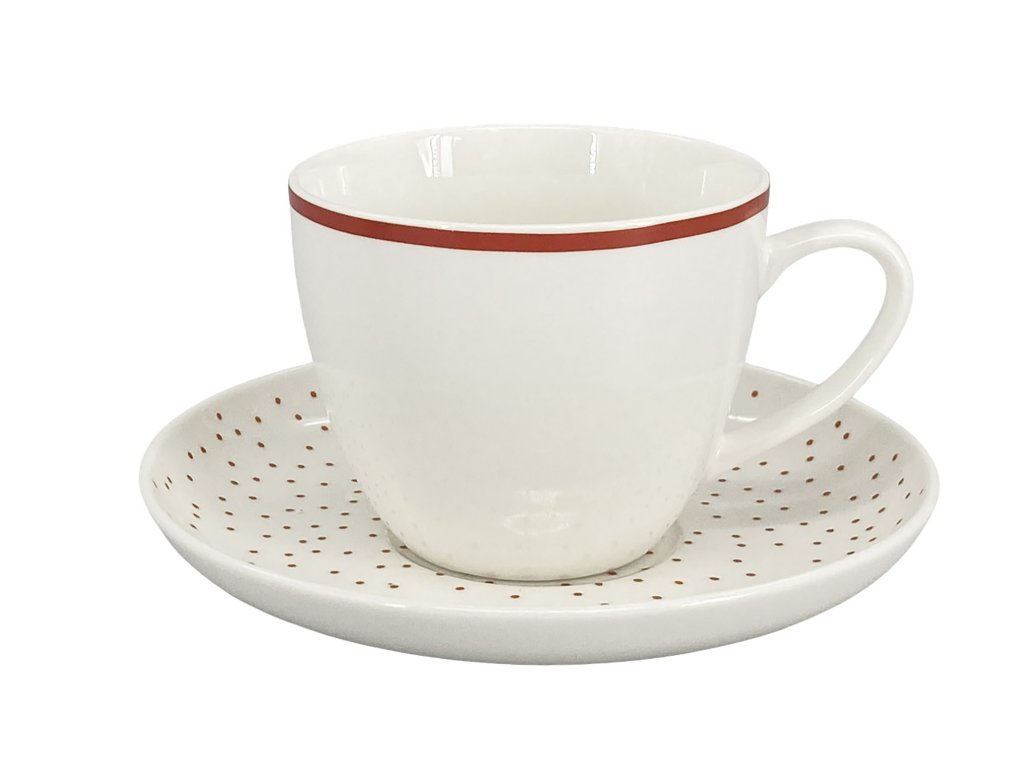 FINE DOTS Bílý porcelánový šálek s podšálkem na kávu, capuccino i čaj. Podkladem šálku s podšálkem je porcelán FINE, který je v tomto případě podekorován výraznou červenou linkou a jemnými červenými tečkami zvenku i zevnitř podšálku. Vhodný nejen pro každodenní příležitosti, ale i pro sváteční stolování.