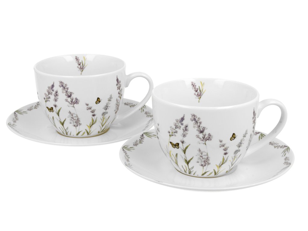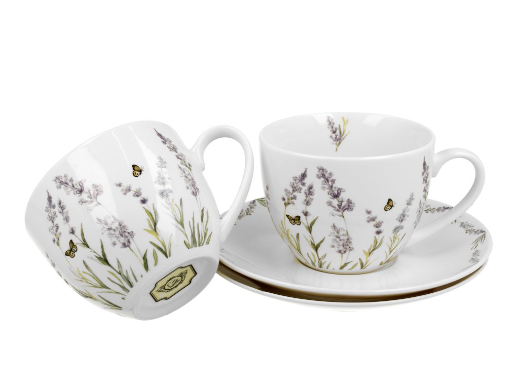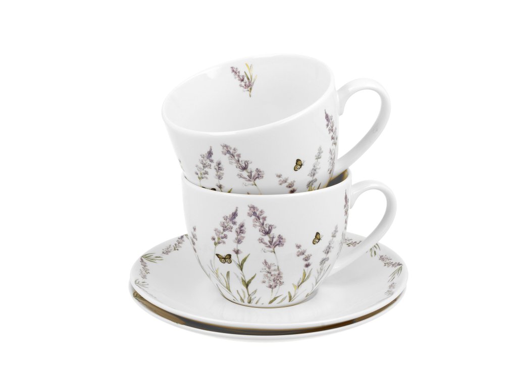PROVANCE porcelánová souprava šálků s podšálkem o objemu 280 ml s oblíbeným motivem levandulí, které připomínají atmosféru Provence, vyrobená z úžasného New Bone China (jemného kostního porcelánu), který se vyznačuje krémovo-bílou barvou (charakteristickou pro jemný kostní porcelán) s jemným leskem a výbornou trvanlivostí.