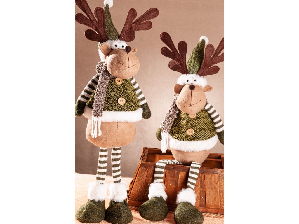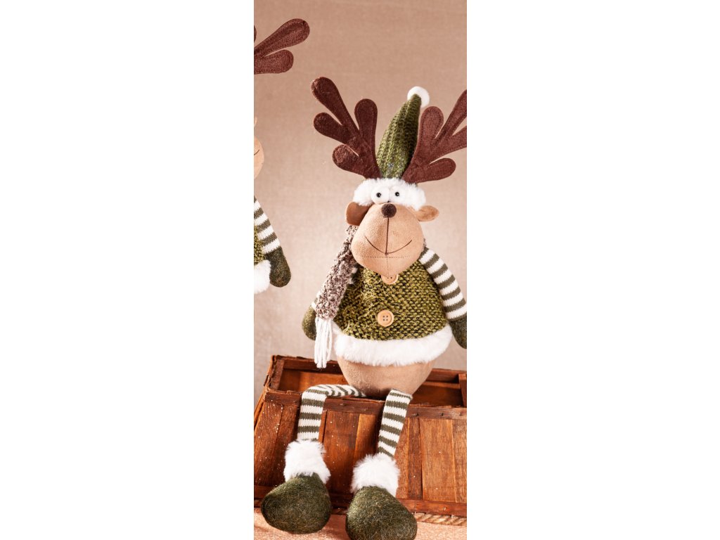 Plyšový sedící sob EDDIE s bimbajícíma nohama výšky 66 cm od špičkové české značky Paramit je originální dekorací. Veselá postavička, která zútulní váš domov. Můžete si ho posadit ke stromečku, na poličku, na parapet. Tam, kam se vám líbí. Má veselé pruhované nohy a ruce, pletený svetr s knoflíky a kolem krku má omotanou šálu.