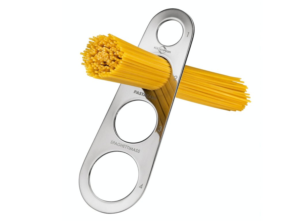 PASTACASA Odměrka na špagety zajistí, že se každý nasytí. A žádné zbytky nebudou muset být znovu použity nebo, co je horší, skončí v koši. Tento kuchyňský pomocník z nerezové oceli má prohlubně pro jednu až čtyři porce. Špagety jednoduše protlačte a vhoďte do vroucí vody. Nemusíte složitě přemýšlet, jaké množství špaget na porci a ušetříte si nespotřebované zbytky špaget. Po použití můžete umýt v myčce nádobí.