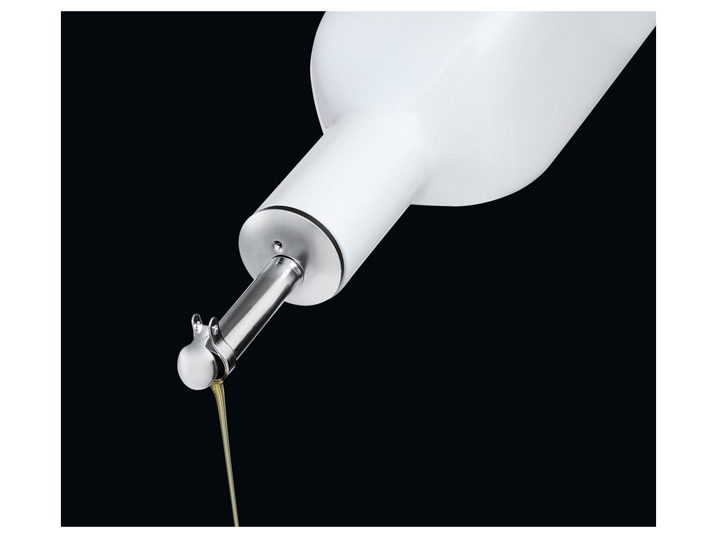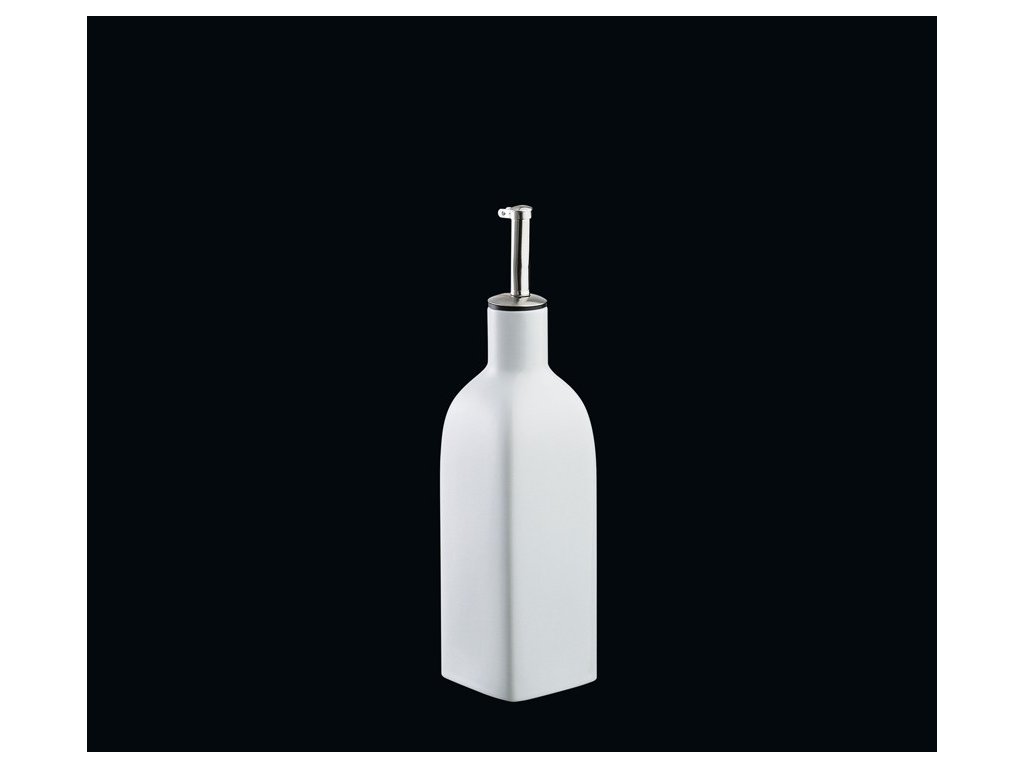 Porcelánová nádoba na ocet nebo olej 350 ml v jednoduché klasické bílé barvě v kombinaci s matnou nerezí a nadčasovým designem, kterou můžete kombinovat s různými typy nádobí.