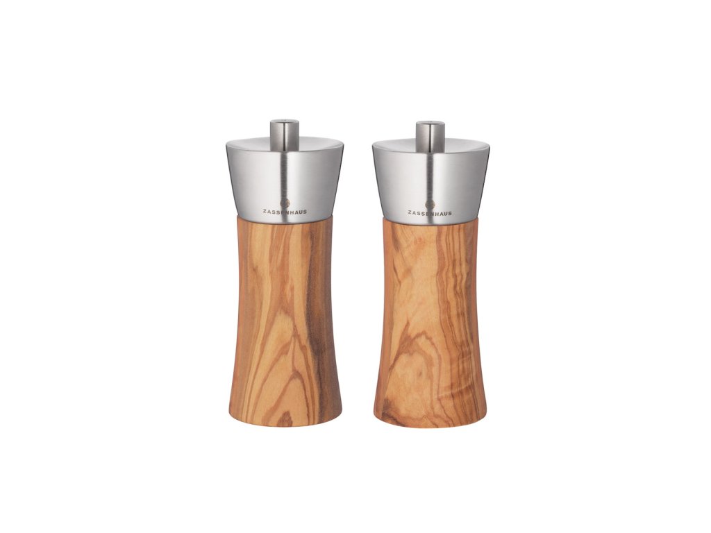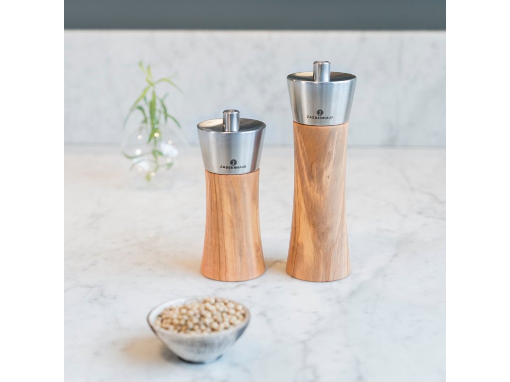 Mlýnky na pepř a sůl AUGSBURG z ušlechtilého dřeva ve spojení s nerezovou ocelí od společnosti Zassenhaus přináší do vaší kuchyně jemnou eleganci. Mají patentovaný mlecí mechanismus, který je tvrdší než ocel a je odolný opotřebení a korozi. Velmi dobře drtí nejen sůl a pepř, ale můžete ho použít i k mletí koření, jako je chilli, koriandr nebo kmín.