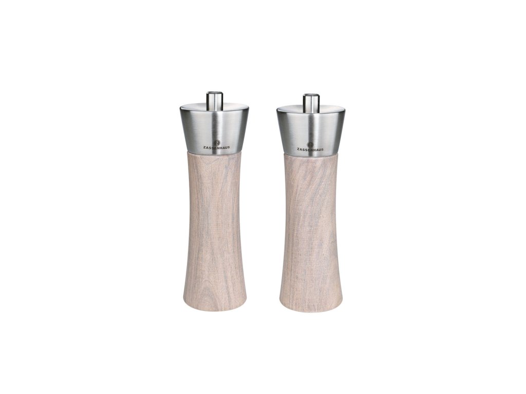 Mlýnky na pepř a sůl AUGSBURG z ušlechtilého dřeva ve spojení s nerezovou ocelí od společnosti Zassenhaus přináší do vaší kuchyně jemnou eleganci. Mají patentovaný mlecí mechanismus, který je tvrdší než ocel a je odolný opotřebení a korozi. Velmi dobře drtí nejen sůl a pepř, ale můžete ho použít i k mletí koření, jako je chilli, koriandr nebo kmín.