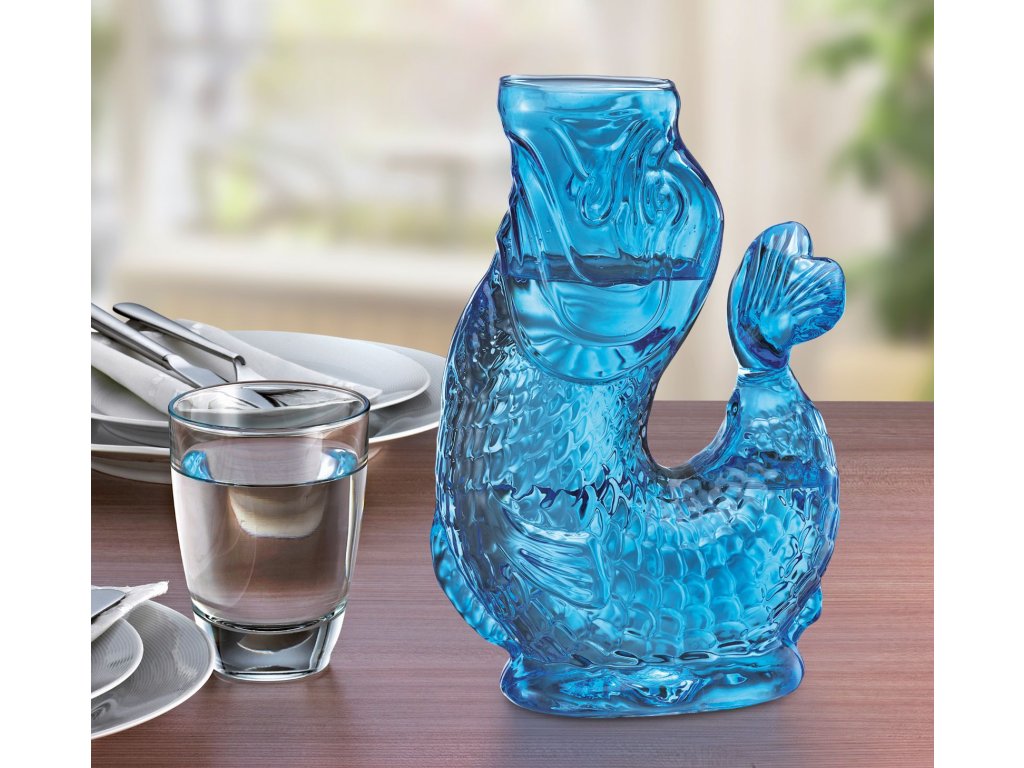 NEMO Skleněná karafa modré barvy o objemu 1 l je nejen praktickým doplňkem, ale také navržená ve tvaru ryby, inspirovaná podvodním světem.