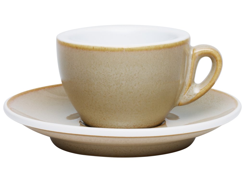 ROMA Pískově žlutý porcelánový šálek na espresso s podšálkem je vyroben z vysoce kvalitního silnostěnného porcelánu, který udrží vaši kávu déle horkou. Objem 50 ml.