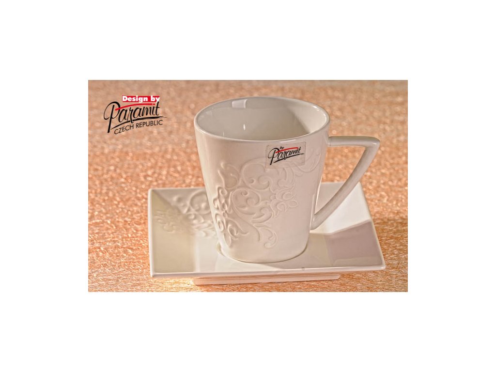 Šálek s podšálkem o objemu 150 ml v bílé barvě s krásnou lesklou a pevnou glazurou a zlatým reliéfem od špičkové české značky Paramit.