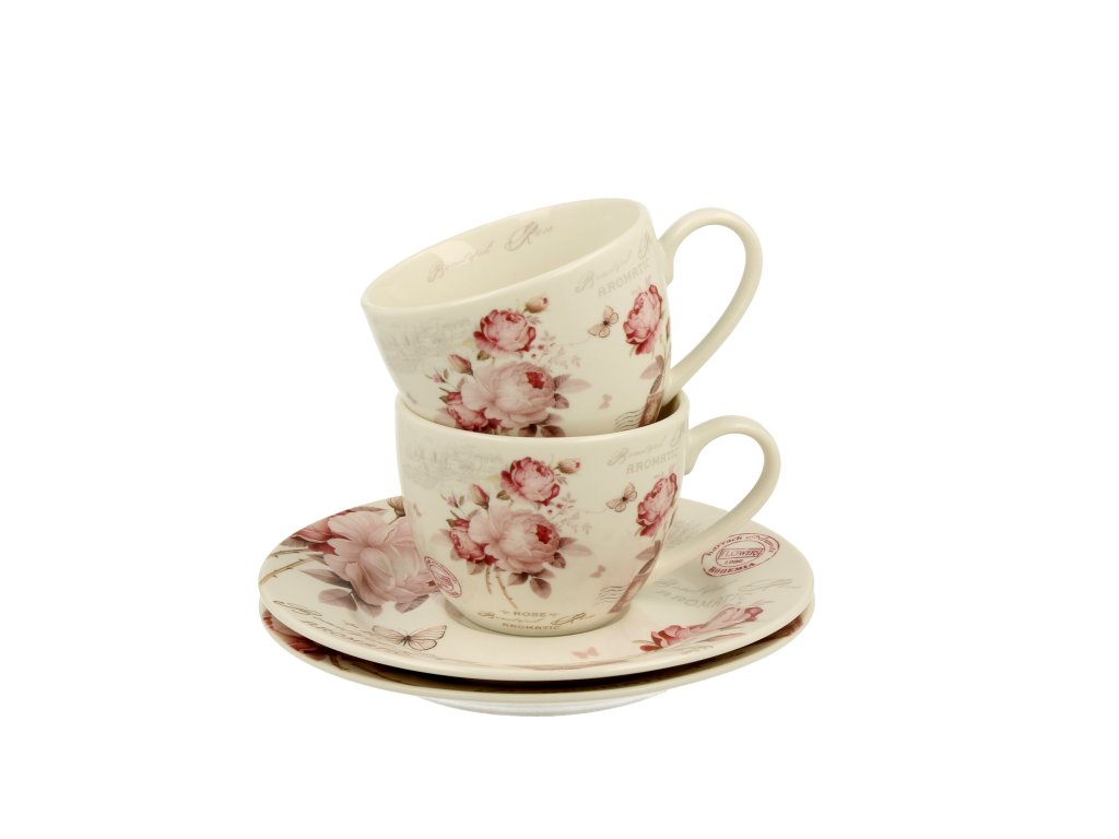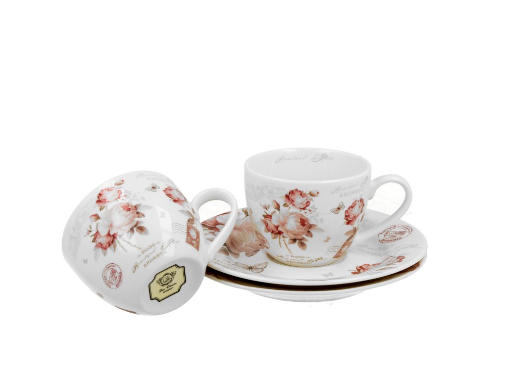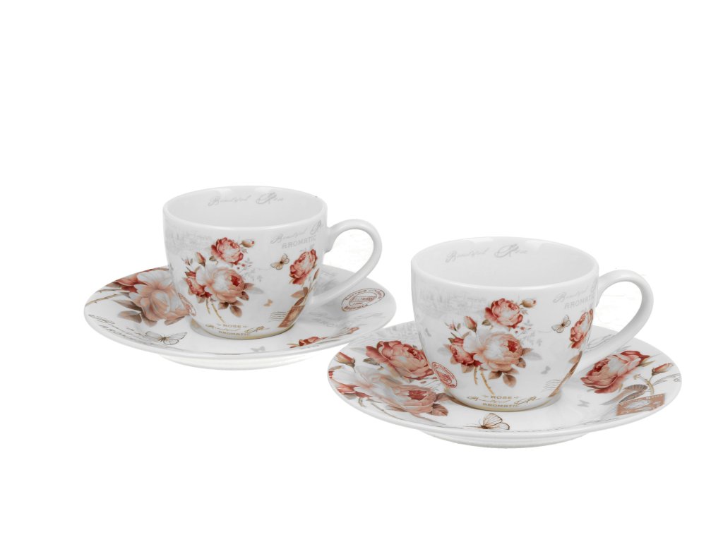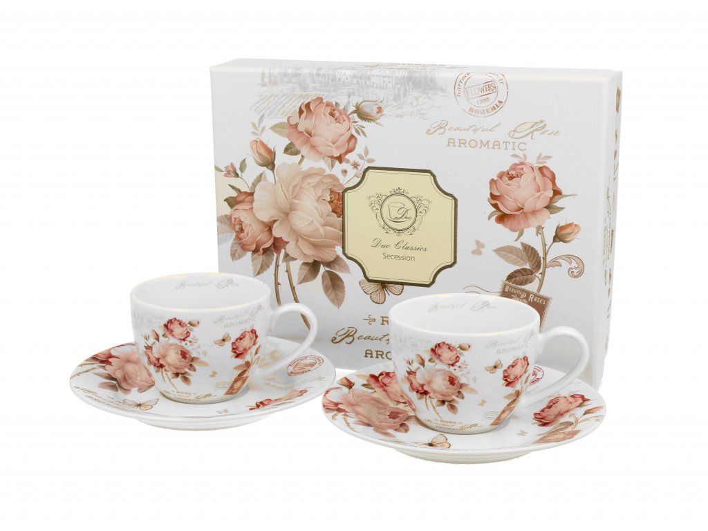 Krásná porcelánová souprava SECESE obsahuje presso šálky s podšálkem - 2 ks objemu 90 ml ze série Duo Classics, která je zdobena motivem květů růží a poštovních známek v teplých a tlumených, pastelových barvách, a je vyrobená z úžasného New Bone China (jemného porcelánu), který se vyznačuje krémovo-bílou barvou (charakteristickou pro jemný porcelán) s jemným leskem a výbornou trvanlivostí.