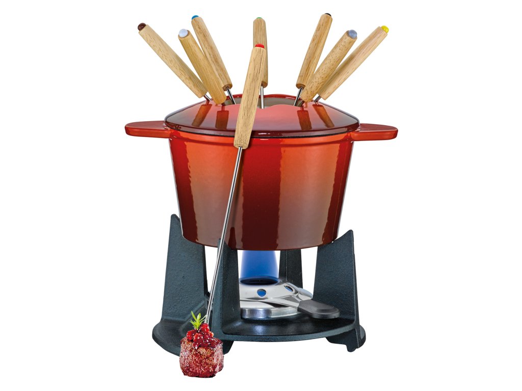 SAAS-FEE sada na fondue pro 8 osob z litiny v lesklé červené barvě od špičkové švýcarské značky SPRING je ideální pro společenské stolování s útulnou atmosférou.