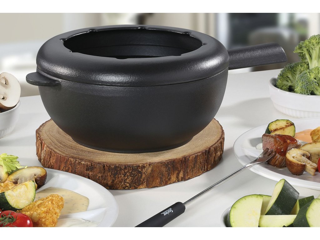 Součástí dodávky je ochranný kryt proti stříkající vodě, který bezpečně drží vidličky na místě a je odnímatelný. Hrnec je vhodný pro fondue na bázi tuku nebo vývaru, ale i pro sýrové fondue.