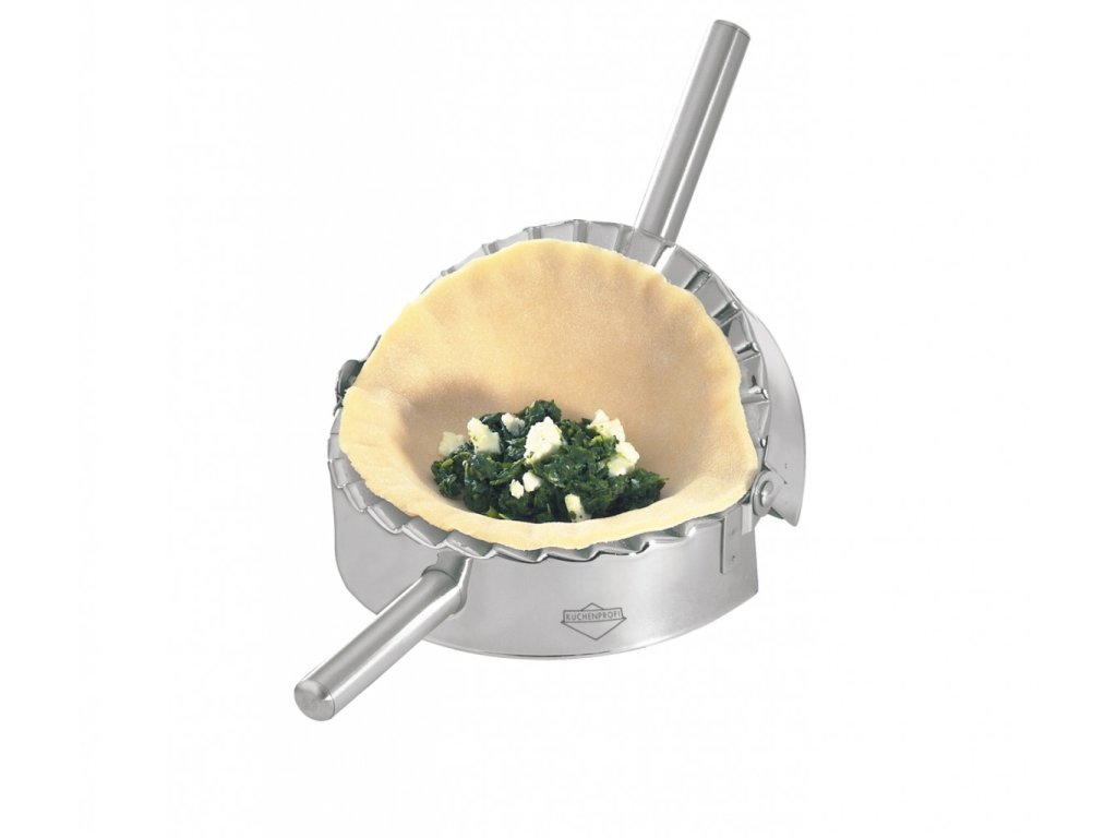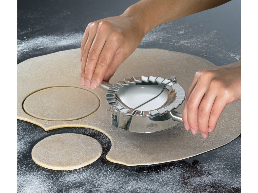 Tato nerezová formička na těstoviny má dvě funkce, vnější stranou těsto řežeme a vnitřní stranou ho zavíráme. Těsto vykrojíte, pak ho naplníte a stisknete oba konce formy dohromady. Těstovina se pak uzavře a je připravena pro vaření v teplé vodě. Vhodné také na švábské ravioli a čínské knedlíky.