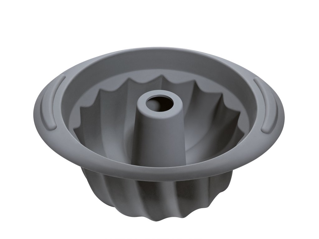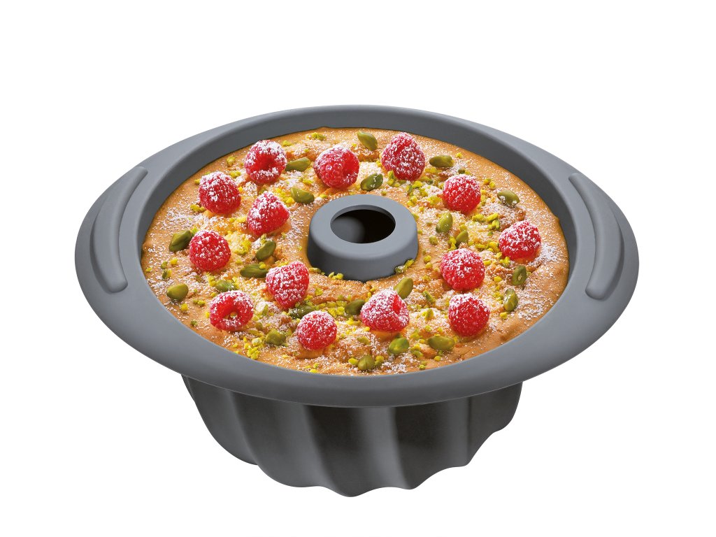 BAKE VARIO Forma na bábovku o průměru 22 cm je vyrobená ze silikonu a je rozměrově stabilní, takže je snadné ji naplnit. Pomocí integrovaných držadel můžete formu bezpečně přepravovat do trouby. Bábovka se dá snadno vyjmout díky elasticitě silikonu.
