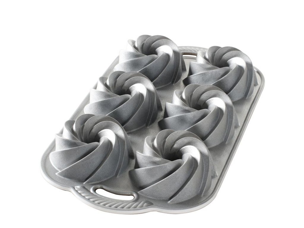 Stříbrná forma na mini dortíky nebo mini bábovky, vycházející z tvaru velmi oblíbené bábovkové formy od špičkové americké značky Nordic Ware je vyrobena z vysoce kvalitního a odolného litého hliníku s nepřilnavou vrstvou, který má dlouhou životnost a je zdravotně nezávadný.