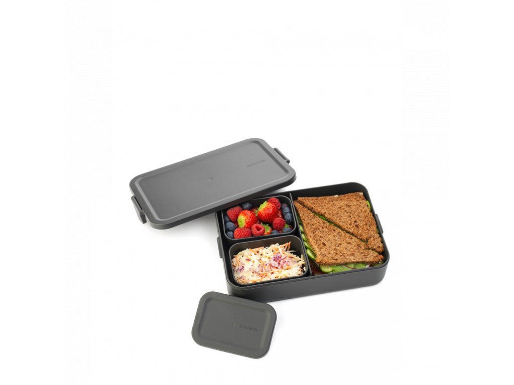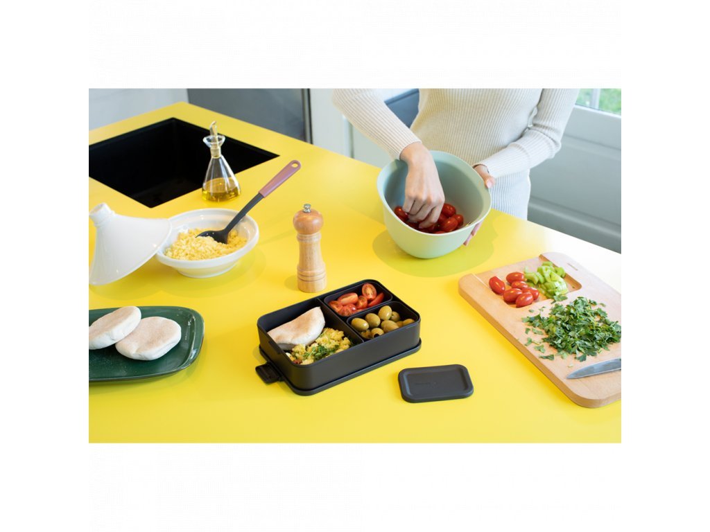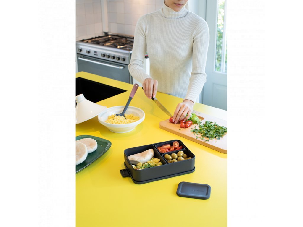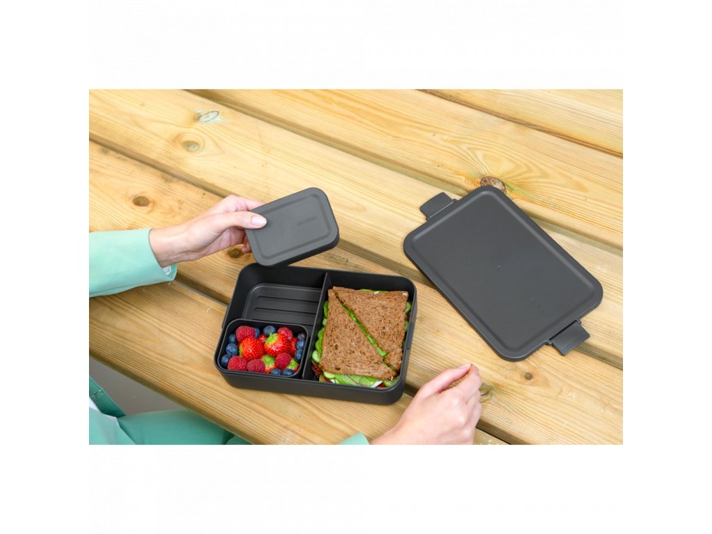 MAKE&TAKE LARGE Tmavě šedý obědový box typu bento na oběd nebo svačinu z kolekce MAKE&TAKE se postará nejen o bezpečnou přepravu vašeho jídla, ale také o to, aby se jídlo nepomíchalo, díky chytré přepážce a dvěma miskám.
