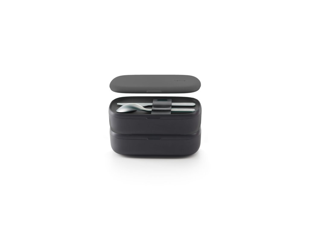 LUNCH BOX TO GO slouží nejen jako svačinový box, můžete ho také použít v případě, že si potřebujete připravit oběd i na cesty. Skládá se ze dvou krabiček (černé barvy), které jsou vzduchotěsné a každá krabička má nahoře přihrádku na příbory, takže je nemusíte lovit po kabelce, ale najdete je tam, kde jste je uložili. Boxy můžete používati v mikrovlnné troubě (maximálně 2 minuty), ale předem odklopte víko.