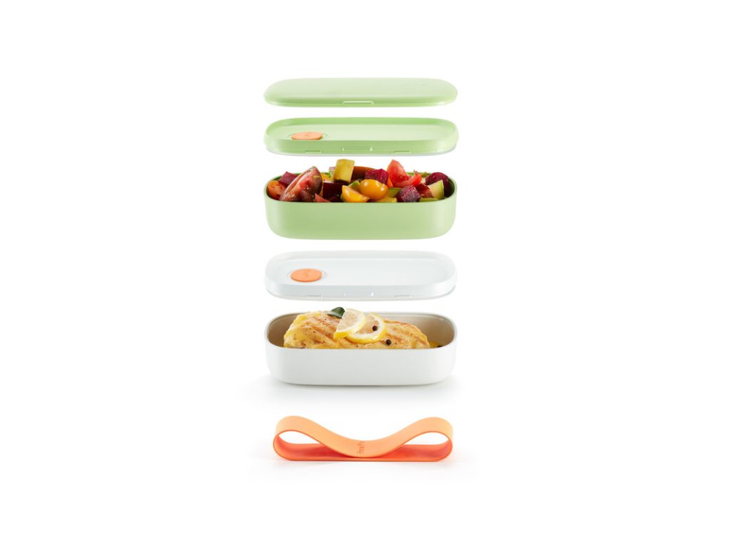LUNCH BOX TO GO slouží nejen jako svačinový box, můžete ho také použít v případě, že si potřebujete připravit oběd i na cesty. Skládá se ze dvou krabiček (zelené a bílé barvy), které jsou vzduchotěsné a každá krabička má nahoře přihrádku na příbory, takže je nemusíte lovit po kabelce, ale najdete je tam, kde jste je uložili. Boxy můžete používati v mikrovlnné troubě (maximálně 2 minuty), ale předem odklopte víko.