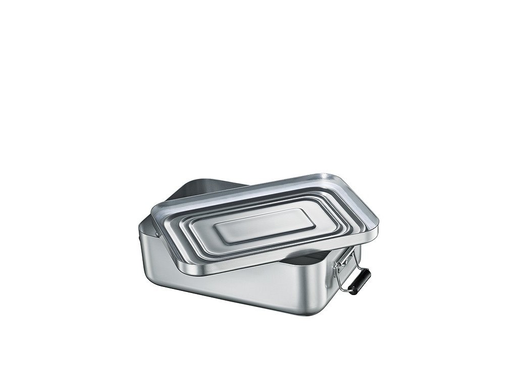 Svačinový box z eloxovaného hliníku ve stříbrné barvě je vhodný pro uchovávání různých potravin. Box má uvnitř nastavitelnou přepážku. Víko je se silikonovým těsněním.
