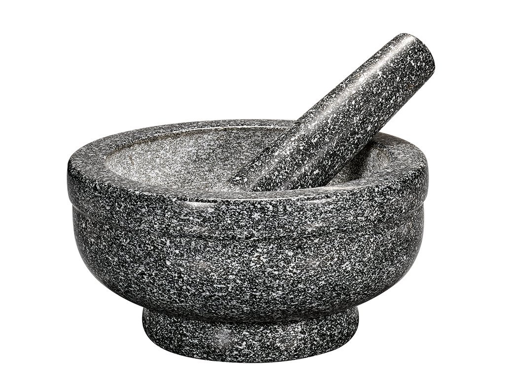 Součástí žulového hmoždíře je i palička ze stejného materiálu. Je vhodný na drcení koření a na výrobu pesta. Robustní palička rozdrtí byliny a koření rychle a bez vynaložení úsilí.