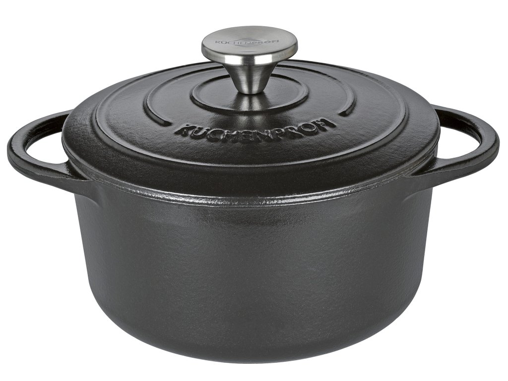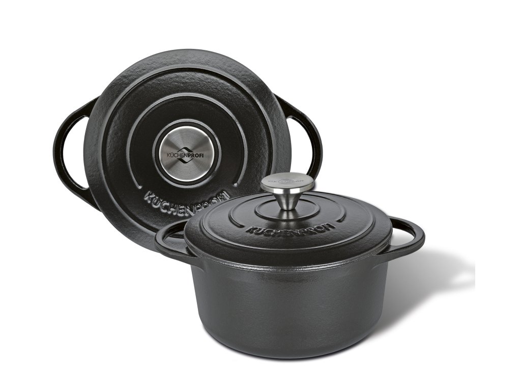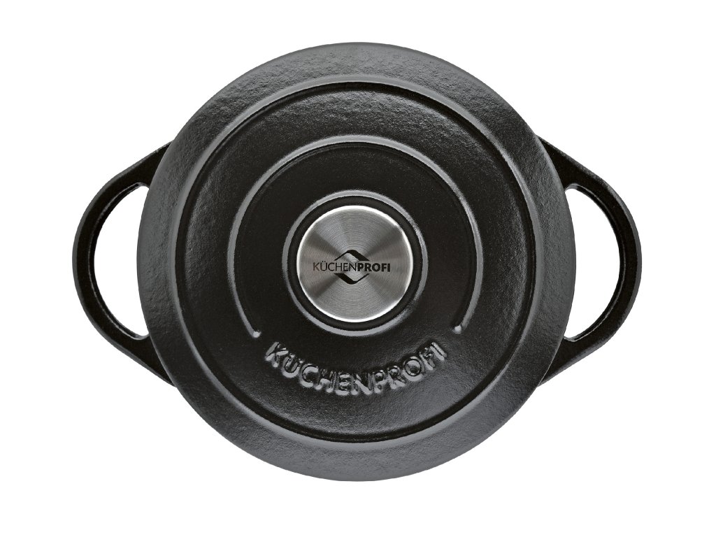Malý kulatý litinový hrnec s poklicí v černé barvě o průměru 20 cm z kolekce litinového nádobí PROVENCE od německé značky Küchenprofi.