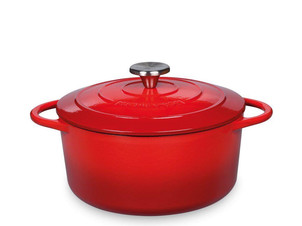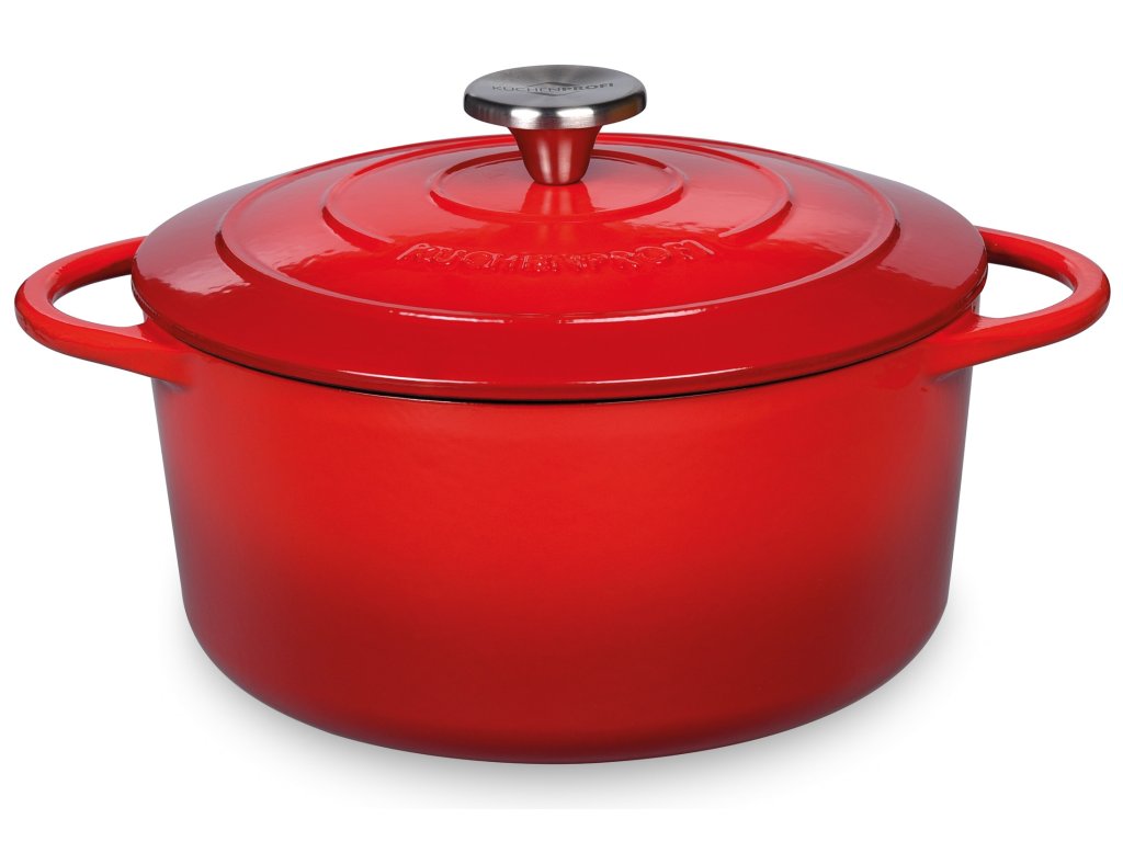 PROVENCE Kulatý litinový hrnec na pečení i vaření s poklicí v zářivě červené barvě, průměr 28 cm od německé značky Küchenprofi.