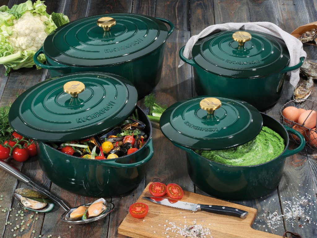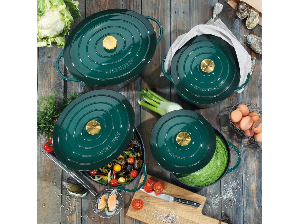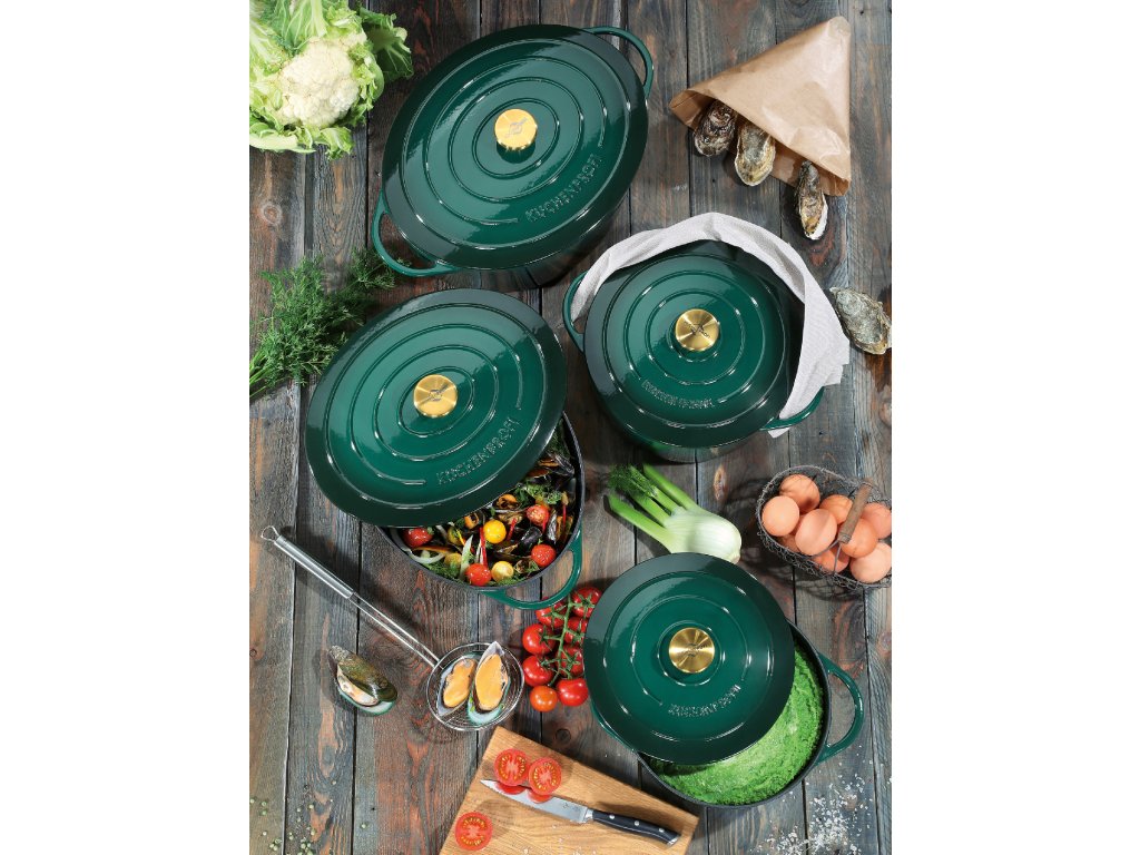 PROVENCE Oválný litinový hrnec na vaření i pečení s poklicí v nové zelené (racing green) barvě, průměr 33 cm, šířka 40 cm od německé značky Küchenprofi. Novinka jaro 2025.