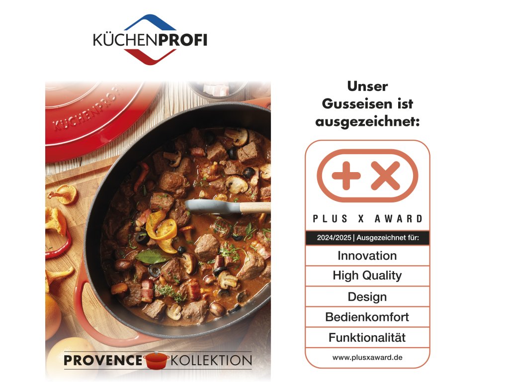 PROVENCE Oválný litinový hrnec na vaření i pečení s poklicí v nové červené Médoc barvě, průměr 33 cm, šířka 40 cm od německé značky Küchenprofi. Novinka jaro 2025.