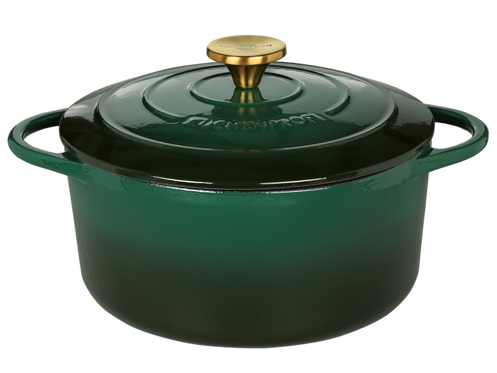 PROVENCE Kulatý litinový hrnec na vaření i pečení s poklicí v krásné tmavě zelené barvě (racing green), průměr 26 cm a objem 5,3 l od německé značky Küchenprofi. Novinka roku 2025.