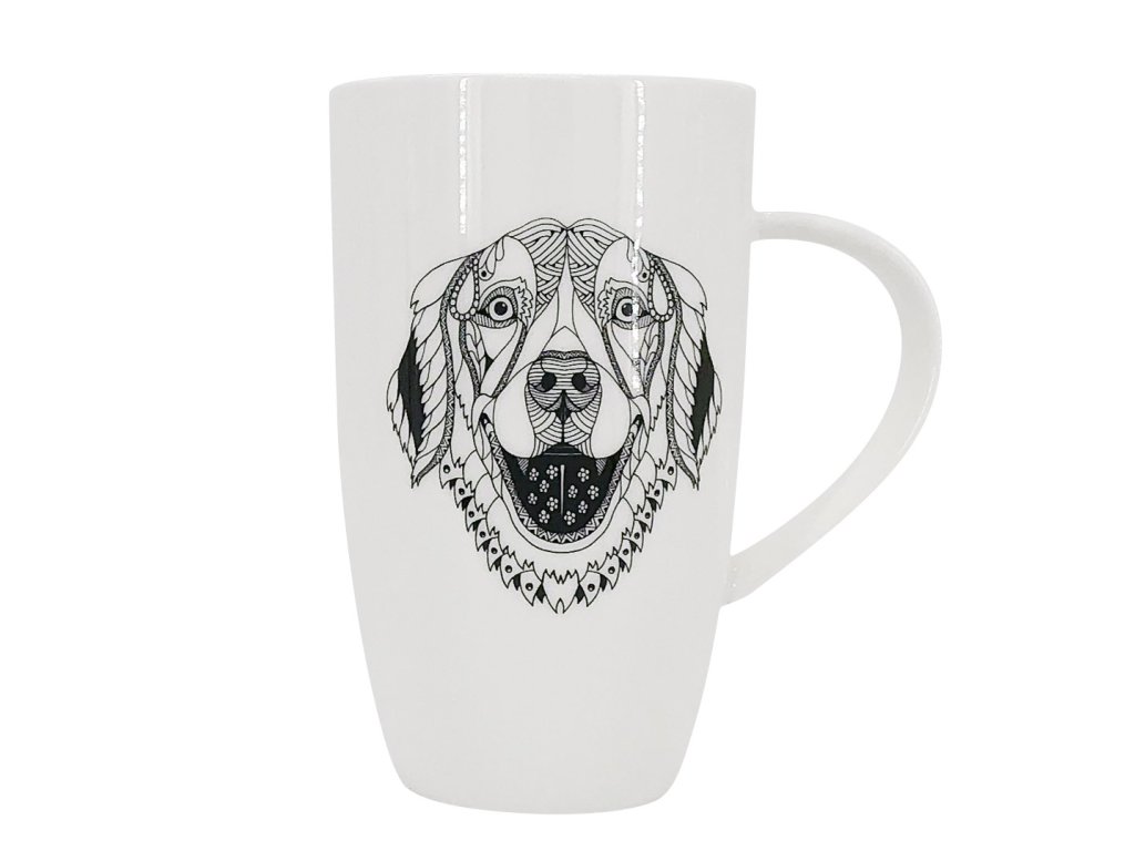 Hrneček má krásný motiv psa retrívra , který je tvořen patchworkovou technikou.