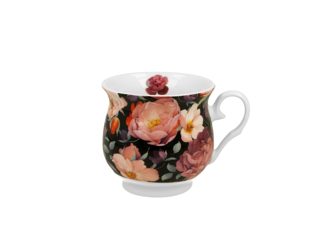 SPRING ROSES BLACK RETRO Hrnek na čaj o objemu 500 ml ze série FLORAL EXCLUSIVE, vyrobený z porcelánu New Bone China, vyznačující se elegantní a přírodní krémově bílou barvou s jemným leskem a mimořádnou trvanlivostí při zachování lehkosti a jemnosti.