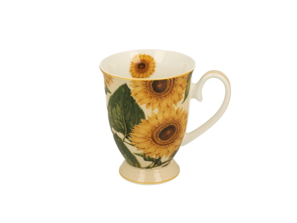 Porcelánový hrneček na kávu nebo čaj o objemu 325 ml s motivem slunečnic je vyrobený z úžasného New Bone China (jemného kostního porcelánu), který se vyznačuje krémovo-bílou barvou (charakteristickou pro jemný kostní porcelán) s jemným leskem a výbornou trvanlivostí.