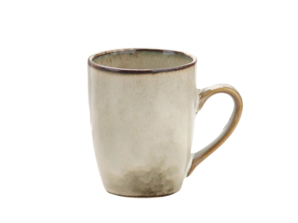 TRIANGLE Keramický hrnek na kávu i čaj o objemu 300 ml z kolekce keramiky TRIANGLE je novinkou roku 2022. Má lesklou stříkanou glazuru v béžové až šedo-béžové barvě, která místy přechází do odstínů šedé a hnědé.