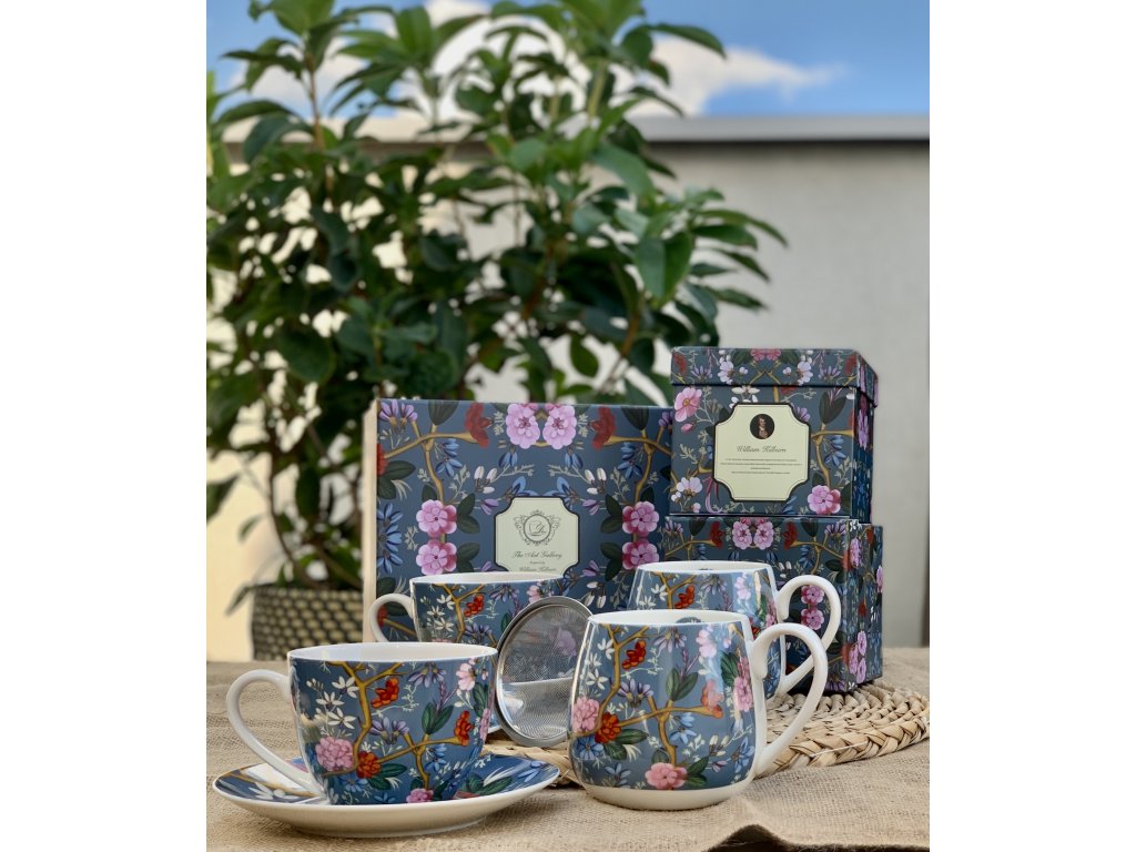 Baculatý hrnek WILLIAM KILBURN BLUE o objemu 430 ml s krásnými pastelovými květinami na šedomodrém podkladu udělá radost každému milovníku bylinných a sypaných čajů.