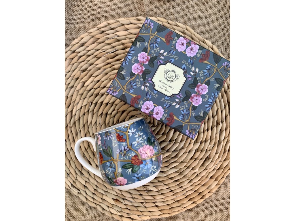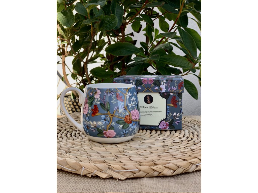 Hrneček je zdobený kompozicí jemných pastelových květů, listů a houští větviček na tlumeném elegantním šedomodrém podkladu. Tato botanická kombinace je typickou ozdobou Kilburn.