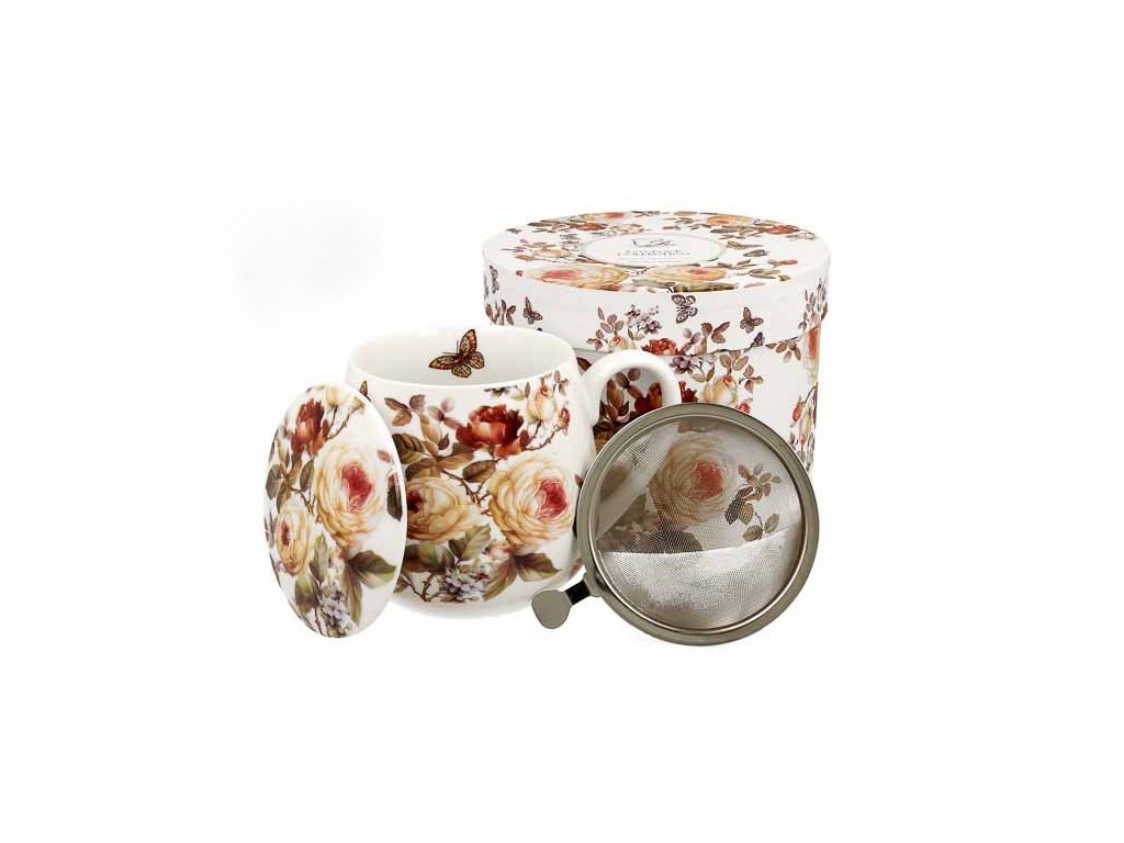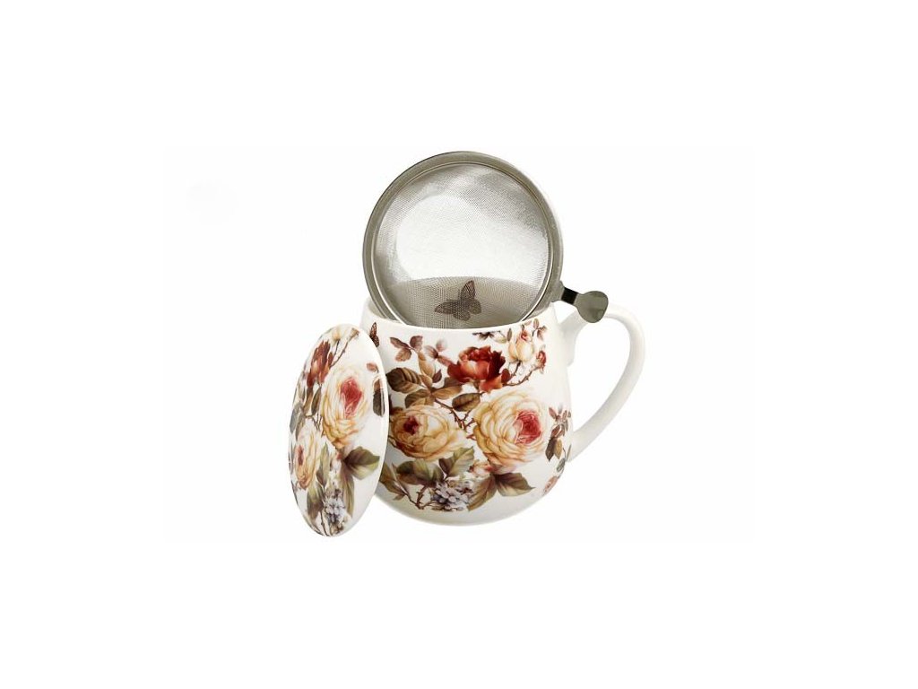 Baculatý hrnek ZAHRA se sítkem a víčkem o objemu 430 ml s krásným motivem růží z jemného kostního porcelánu od vynikající značky DUO. Hrneček ZAHRA je vyrobený z jemného porcelánu New Bone China, vyznačující se elegantní a přírodní krémově bílou barvou s jemným leskem a mimořádnou trvanlivostí při zachování lehkosti a jemnosti.